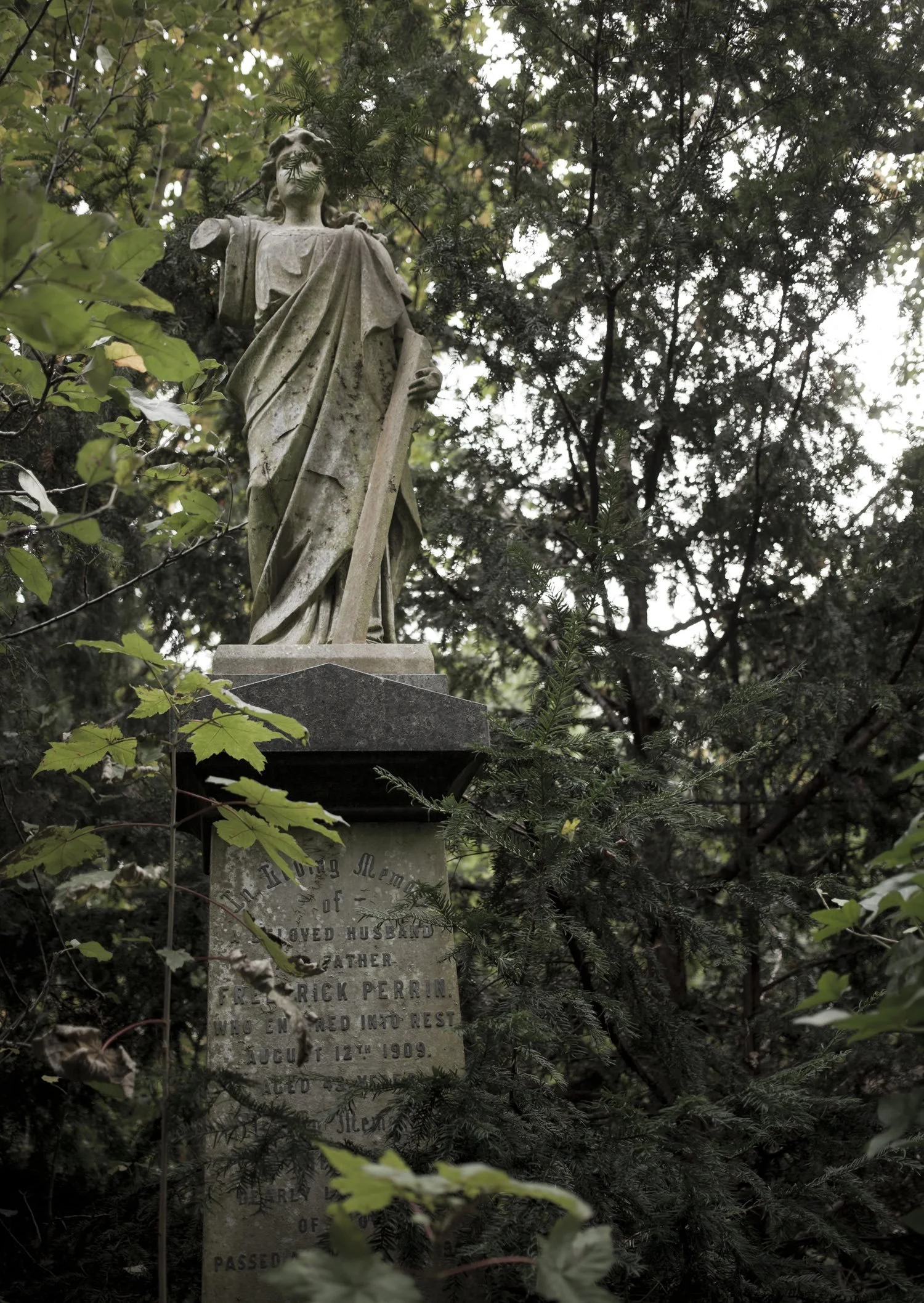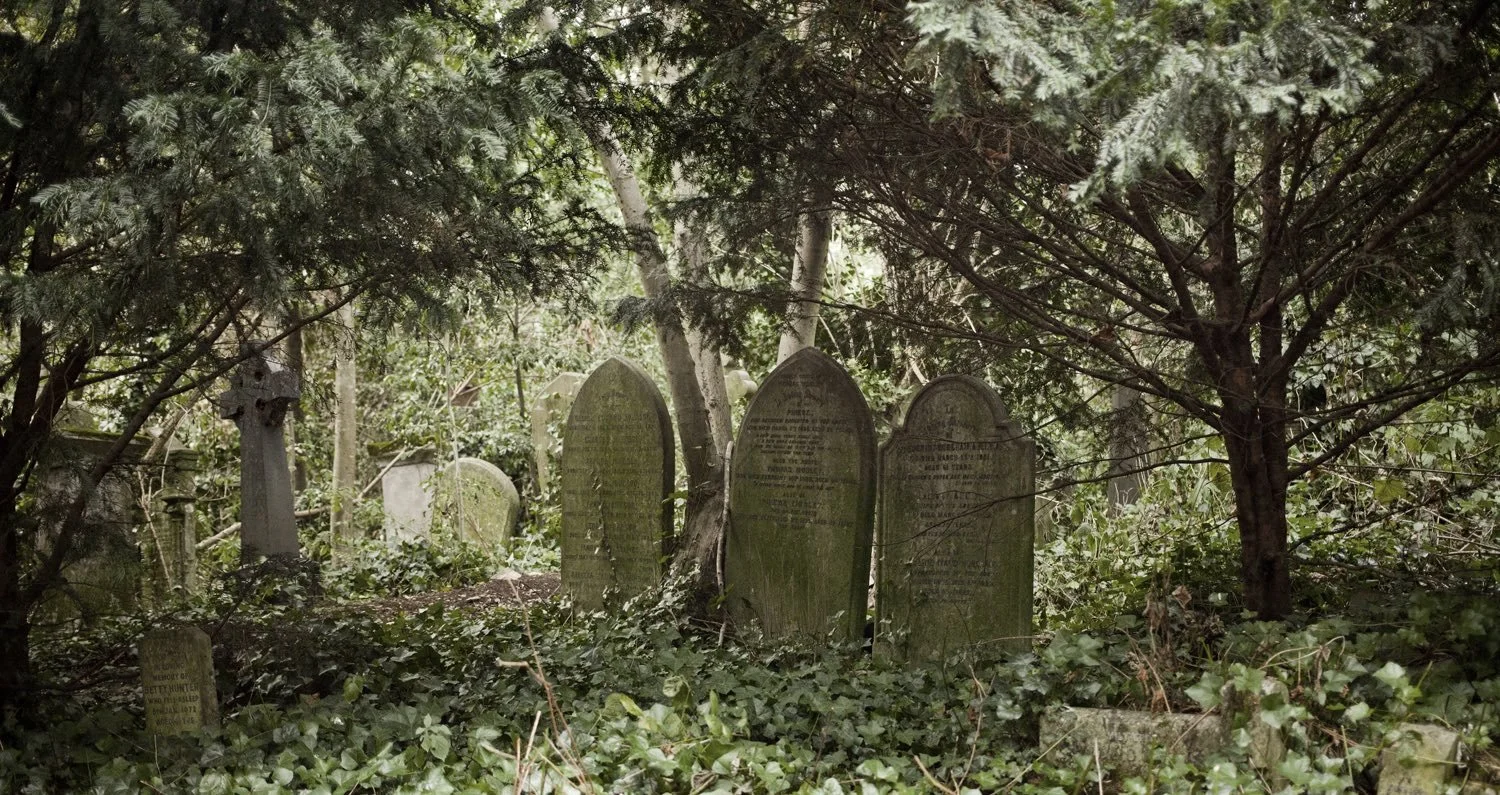 Dès l’entrée, on est accueilli par un portail imposant dans le style néo-égyptien, décoré de hiéroglyphes qui signifient “la demeure de la partie mortelle de l’homme”. Derrière, un réseau d’allées ombragées serpente entre des pierres tombales couvertes de mousse, des anges penchés, des croix qui semblent prêtes à basculer.