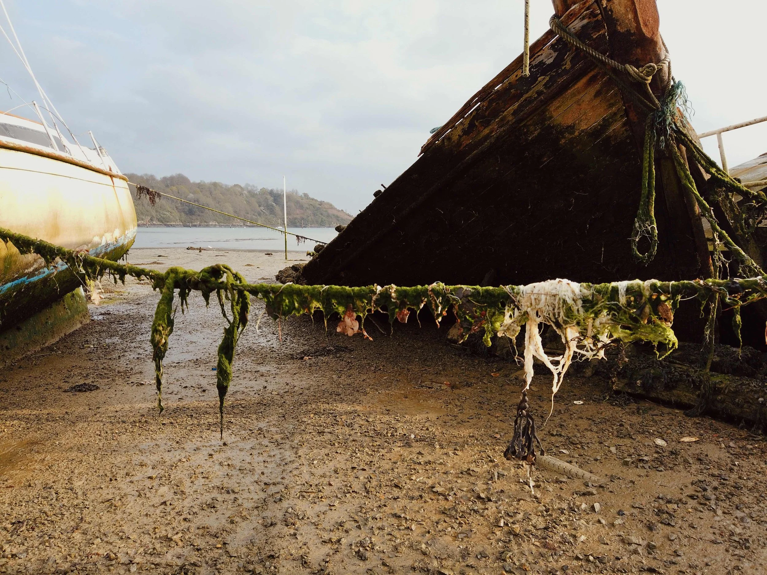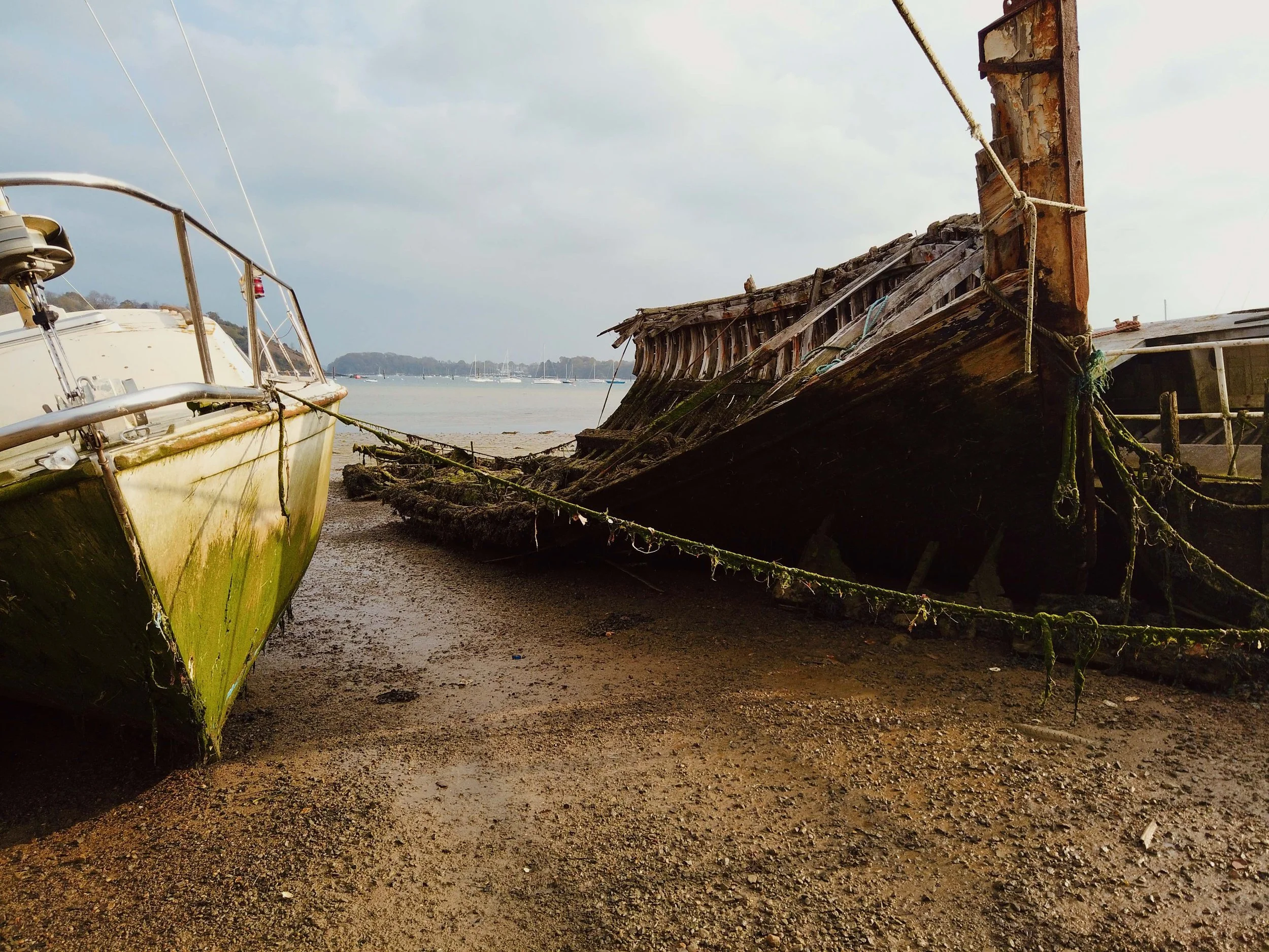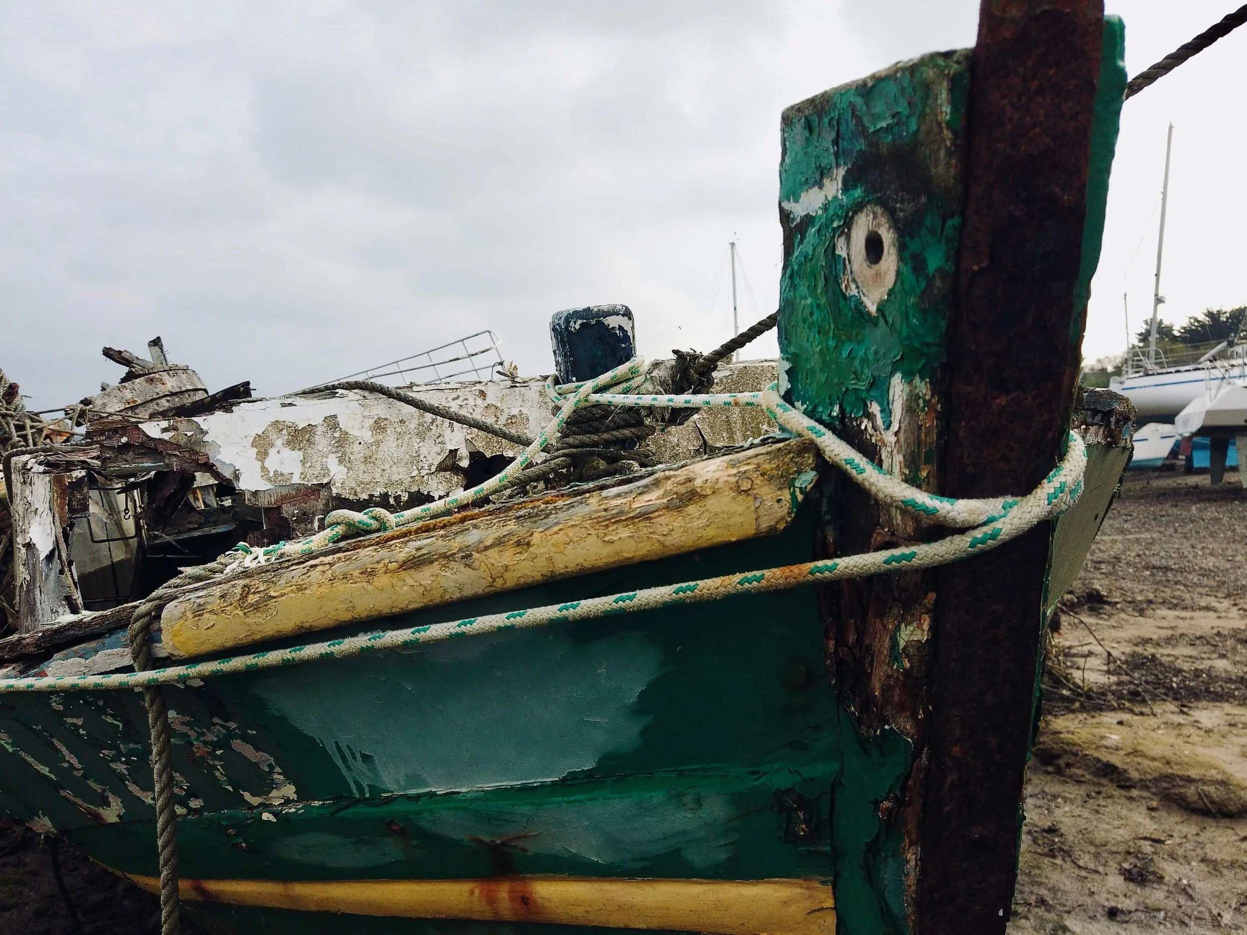 Les bateaux abandonnés, les cris des mouettes, le bruit du bois qui geint. Parfois, un rayon de soleil se glisse faisant miroiter la mer, et les épaves deviennent de somptueuses sculptures. Elles gagnent en poésie dès qu’on les regarde avec un peu d’attention. Le sable humide, les coquillages abandonnés, les lignes douces de la plage recouverte de mousse marine, tout ça mêlé au bruit des vagues, à l’odeur salée…