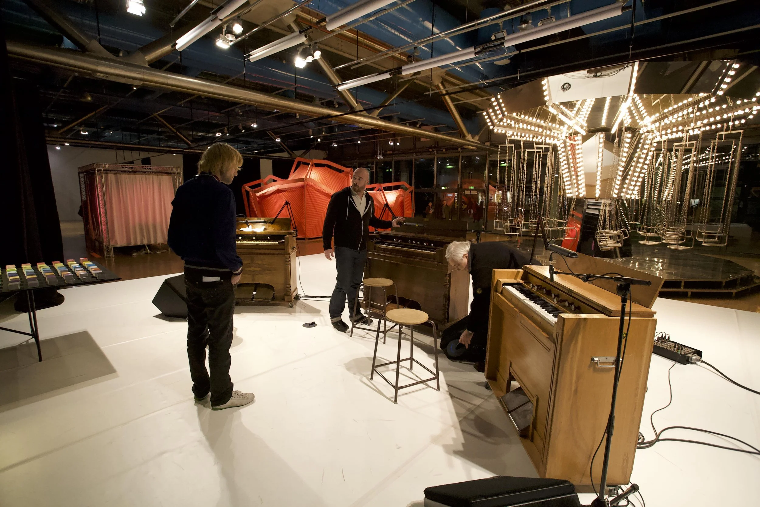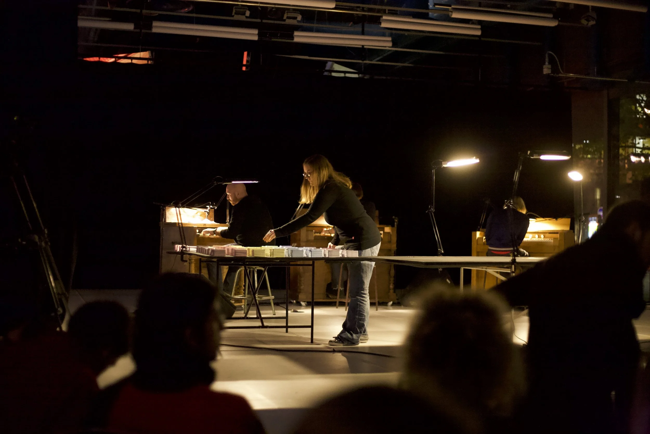 L’idée ? Sur scène, trois harmoniums (des sortes d’orgues qui ronronnent comme des chats enrhumés) jouaient une musique minimale et très lente. Et moi, je devais traduire ces sons en couleurs et en direct, devant le public. J’avais des jeux de cartes colorées posées sur une table près de moi, un véritable Pantone à porté de main. Devant moi, une table vide avec une camera braquée dessus. Une à une j’attrapais les cartes et les disposais de façon à ce que cela corresponde le mieux à ce que je « voyais » dans ma tête.