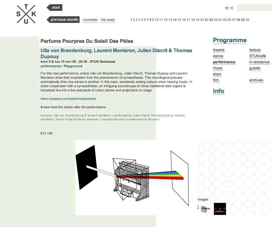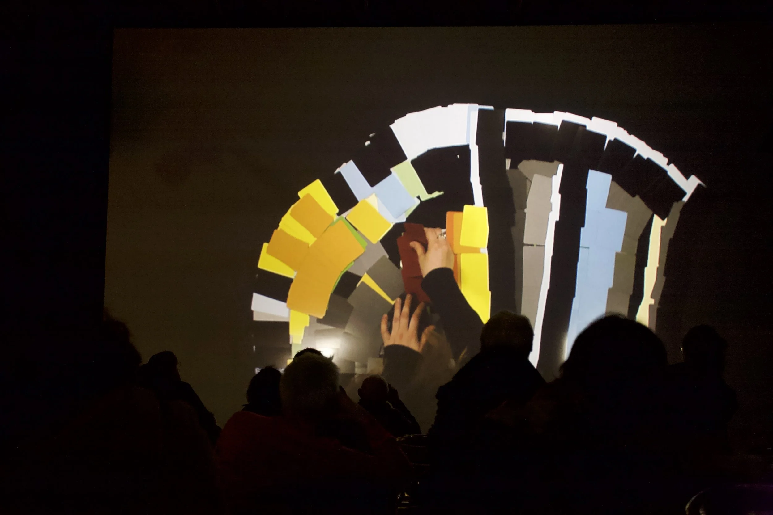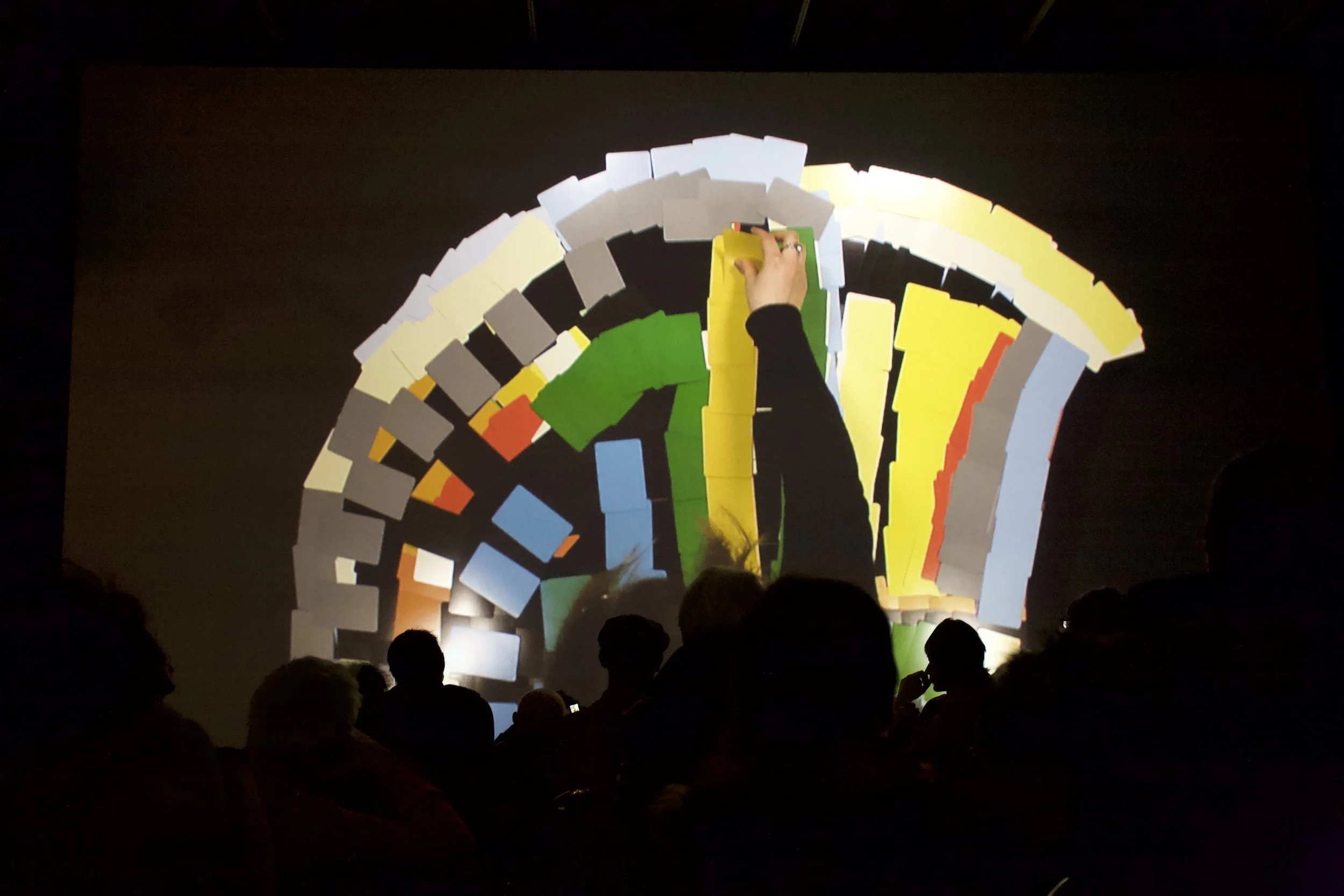 Quelques semaines plus tard, on a réitérer l’expérience. J’ai embarqué pour Louvain en Belgique, au STUK Kunstencentrum, dans le cadre du festival Playground (où art contemporain et performance se mélangent). Là encore, j’ai rejoint l’équipe d’Ulla pour une version belge de la même expérience : traduire en live une œuvre sonore en partition de couleurs, comme si j’étais une espèce de décodeuse humaine entre le son et l’image.